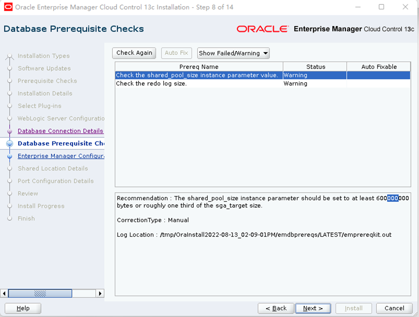 安装EM13C时,条件检查时出现Theshared_pool_size ins
