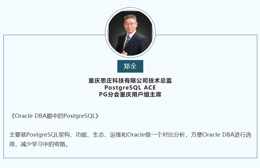 郑全,重庆思庄科技有限公司技术总监、PostgreSQL ACE,PG分会重庆用户组主席